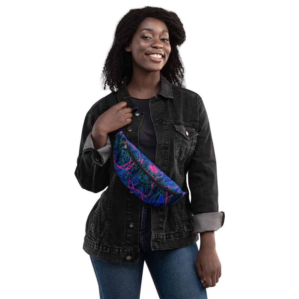 Keep your hands free and your vibe high with the 'LARIMAR' Fanny Pack, the ultimate accessory for ravers on the move. Inspired by the serene yet striking blue hues of the Larimar stone, this fanny pack boasts a bold neon blue and green print that glows under festival lights. Crafted from 100% polyester with water-resistant material, it’s perfect for keeping your essentials safe during raves, vacations, or urban adventures. With a 0.37-gallon capacity, a customizable inner pocket, and adjustable straps, this bag blends style and function. Wear it around your waist, across your chest, or over the shoulder to match your 'LARIMAR' collection pieces for a unified rave look.