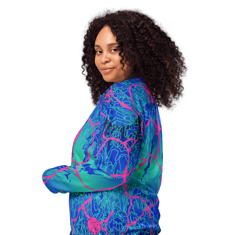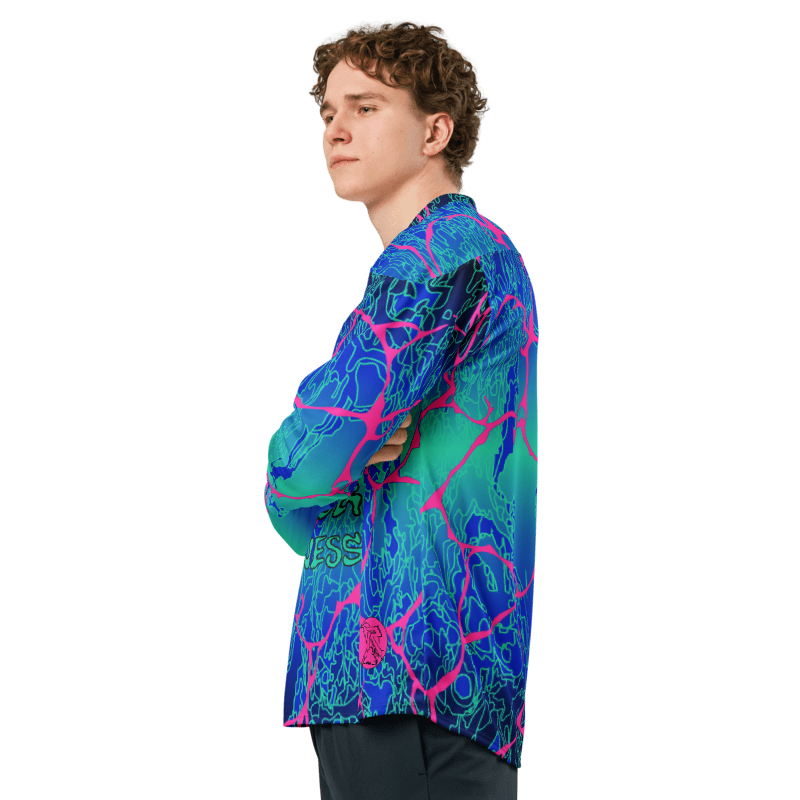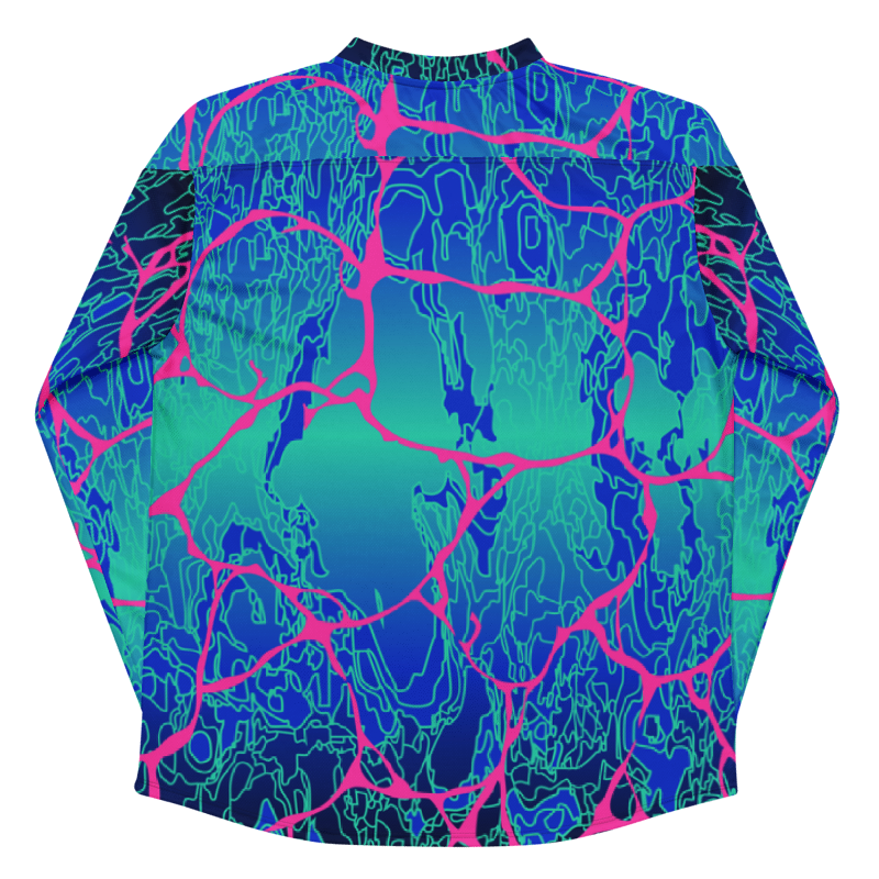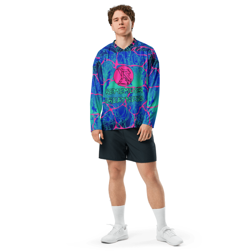Ignite the rave with the 'LARIMAR' Recycled Hockey Jersey, a standout piece for ravers who blend team spirit with festival flair. Inspired by the serene yet vibrant blue hues of the Larimar stone, this jersey features bold neon blue and green patterns that pulse under festival lights. Crafted from 100% recycled polyester with a hockey-specific construction, its moisture-wicking, two-way stretch fabric keeps you cool and comfortable during high-energy dance sessions or streetwear moments. The relaxed fit, rounded shoulder yoke, and V-neck collar deliver authentic style, while UPF50+ protection makes it perfect for outdoor festivals. Pair it with the 'LARIMAR' Track Pants for a unified rave look or rock it solo to turn heads.